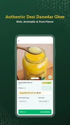 कंट्री डिलाइट ऐप के साथ रोज़ सुबह 7 बजे तक ताज़ा दूध और किराने का सामान घर पर पाएं। गाय का दूध, उच्च प्रोटीन दूध, शुद्ध घी, दही, ब्रेड, फल और सब्ज़ियां जैसे उत्पादों की विस्तृत श्रृंखला से चुनें। मुफ़्त VIP ट्रायल के साथ 40% तक की छूट का लाभ उठाएं। सुविधा और बचत का अनुभव करें!