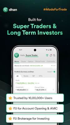 Dhan 1 मिलियन से अधिक उपयोगकर्ताओं का भरोसेमंद ऐप है। यह ट्रेडर्स और निवेशकों के लिए गति, उन्नत उपकरणों, विश्वसनीयता और बेहतरीन ग्राहक सहायता वाला पसंदीदा ट्रेडिंग प्लेटफॉर्म है।