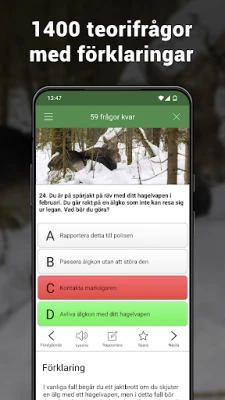 Jägarexamen आपको "Jaktresan" नामक एक अद्वितीय शैक्षिक खेल के माध्यम से पूरी सिद्धांत शिक्षा को सीखने का अवसर प्रदान करता है। यह गेम छोटे सिद्धांत पाठों, कला प्रस्तुतियों, वीडियो और विभिन्न प्रकार के परीक्षणों के साथ आपके ज्ञान का निर्माण करता है। जैसे-जैसे आप खेलते हैं, आप सितारे एकत्र करते हैं और पदक अनलॉक करते हैं, और खेल के अंत तक, आप वास्तविक सिद्धांत परीक्षा पास करने के लिए आवश्यक सभी ज्ञान से लैस होंगे। इसके अलावा, ऐप छह विभिन्न प्रकार के अभ्यास परीक्षणों से भरा है, जिनमें आपकी समझ के स्तर के अनुसार अनुकूलित स्मार्ट अभ्यास, वन्यजीव परीक्षण, विषय-आधारित परीक्षण, केवल पक्षी-चित्रों वाले परीक्षण और यथार्थवादी सिद्धांत परीक्षण शामिल हैं। 1,400 से अधिक प्रामाणिक प्रश्नों के विशाल डेटाबेस के साथ, प्रत्येक प्रश्न की स्पष्ट व्याख्या आपको जटिल अवधारणाओं को भी आसानी से समझने में मदद करती है।