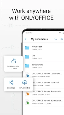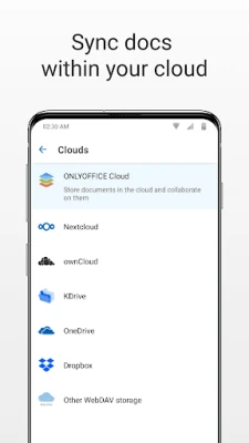यह सुविधा आपको अपनी फ़ाइलों को स्थानीय रूप से प्रबंधित करने की भी अनुमति देती है; टेक्स्ट दस्तावेज़ और स्प्रेडशीट संपादित करें, प्रस्तुतीकरण, PDF, फोटो और वीडियो फाइलें देखें, और फाइलों को क्रमबद्ध, नाम बदलने, स्थानांतरित करने, कॉपी करने और फ़ोल्डर बनाने जैसे कार्यों को आसानी से करें। WebDAV के माध्यम से क्लाउड स्टोरेज के साथ एकीकरण करके ONLYOFFICE की क्षमताओं का विस्तार करें। यह सुविधा आपको कनेक्टेड क्लाउड्स में संग्रहीत दस्तावेज़ों को सीधे प्रबंधित, संपादित और देखने में सक्षम बनाती है, फाइलों को अपलोड या डाउनलोड करने की अनुमति देती है, और आपकी संग्रहों और निर्देशिकाओं पर पूर्ण नियंत्रण प्रदान करती है, जिससे आपकी उत्पादकता हर जगह बनी रहती है।